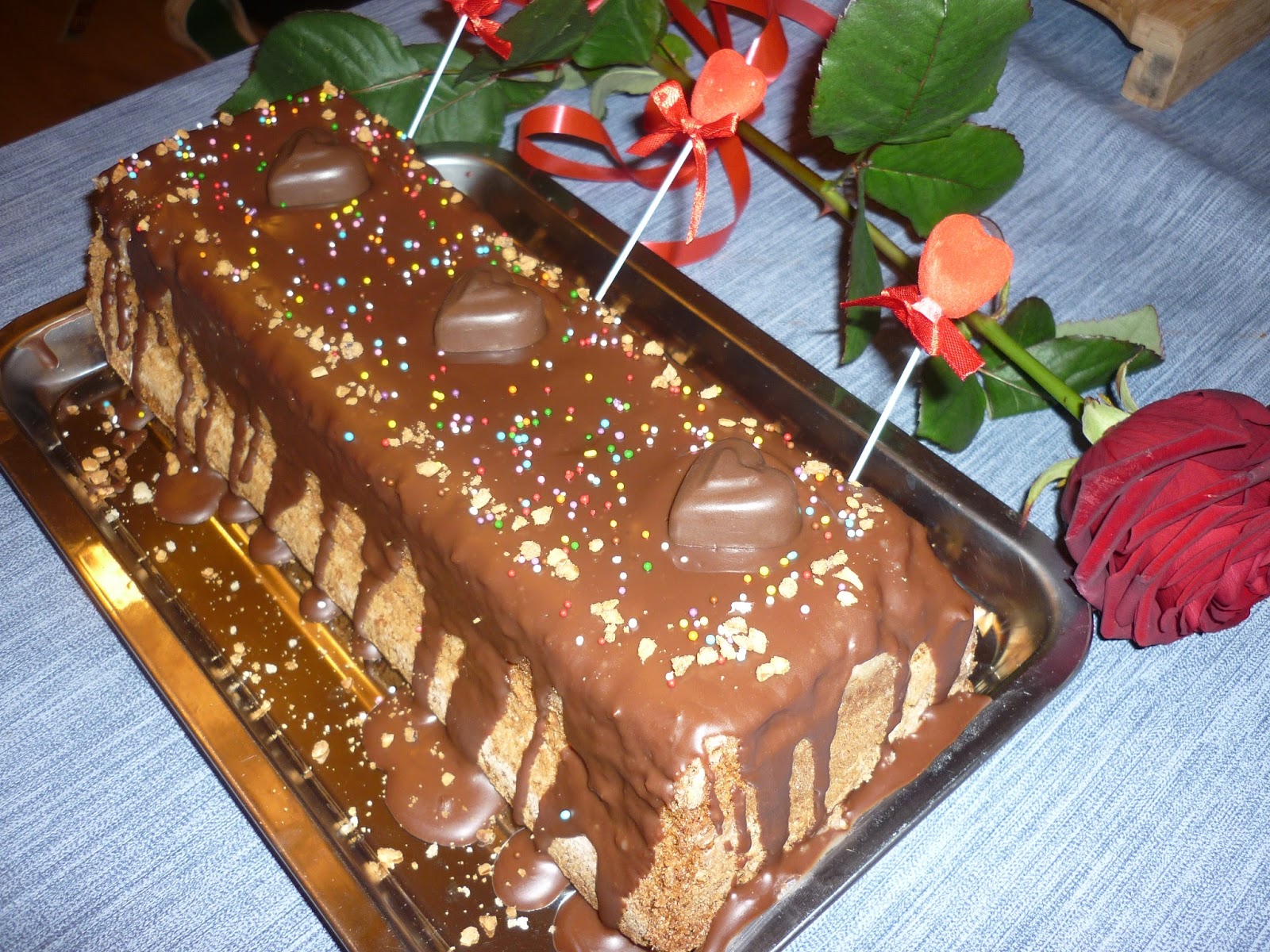 След като сладкишът се охлади, той се украсява пожелание. Аз в случая го залях с шоколадов ганаш (100 мл сладкарска сметана + 150 г шоколад) и посипах с захарни фигурки и шоколадови сърчица.