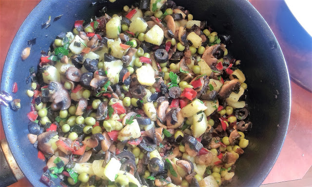 Приготвя се плънката, като се задушават в малко мазнина връзката зелен лук, нарязан на ситно, нарязаните пиперки и наситнените гъби. След като се задушат, свалят се от котлона и се прибавят нарязаните маслини, консервата грах и магданоз.